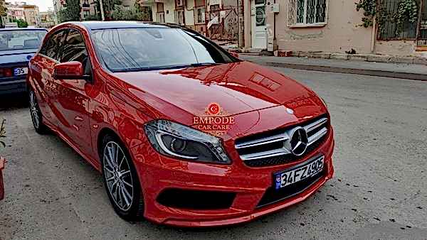 Kırmızı renk Mercedes A180 marka araca seramik kaplama ve detaylı temizlik uygulamamız.